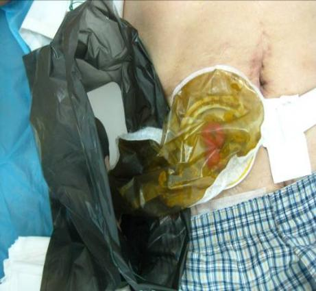 排泄物:一般术后48~72h开始排泄,回肠造口最初为黏稠、黄绿色的黏液或水样便,逐渐过渡到褐色、糊样便;结肠造口排泄物为褐色、糊状或软便。若排泄物含有血性液体或术后5天仍无排气、排便等均为异常。