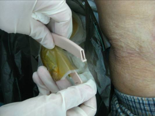 3.观察摘除下的造口袋(底盘的渗漏的位置)