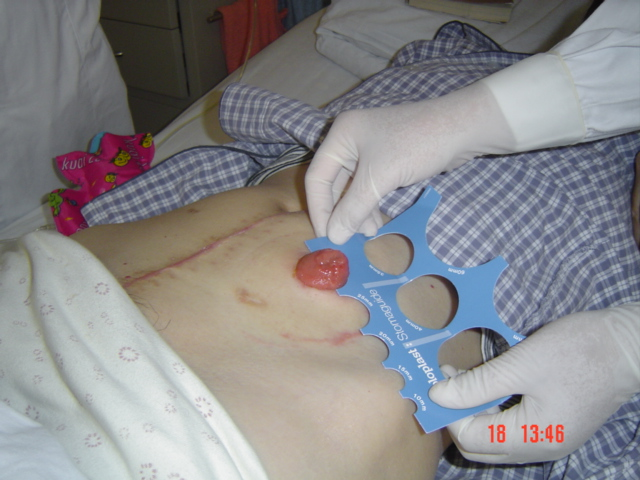 高度:造口理想高度为1~2cm。若造口高度过于平坦或回缩,易引起潮湿相关性皮肤损伤;若突出或脱垂,会造成佩戴困难或造口黏膜出血等并发症。
