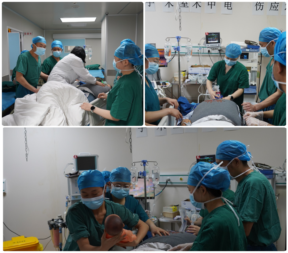 联合抢救惊心动魄。产妇经绿色通道安全转运至手术室,各科医生迅速就位,医务科詹正艳科长到场调度指挥抢救工作。实施紧急剖宫产后,分娩一重度窒息男婴,呼吸和心跳微弱,随即新生儿窒息复苏和产妇抢救分组同时进行。产妇急救经历了呼吸和心跳骤停、产后出血等,在各方协作下转危为安;在进行新生儿窒息复苏术后,新生儿也脱离危险。